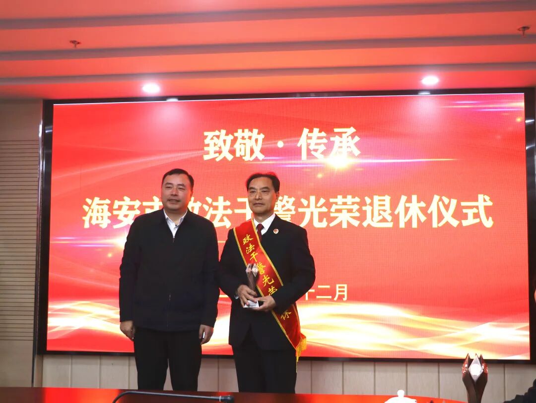 “我代表在座的退休干部表态:退岗不退色、退职不退责,我们将充分发挥政法老同志的优势和特长,以实际行动践行、传承“公正司法、司法为民”宗旨,做到老有所学、老有所为,为海安政法事业发展奉献自我,为推动海安高质量发展贡献力量。”12月28日在海安市政法干警光荣退休仪式上,海安市检察院原党组成员、纪检组长张英祥作为退休干部代表发表退休感言。